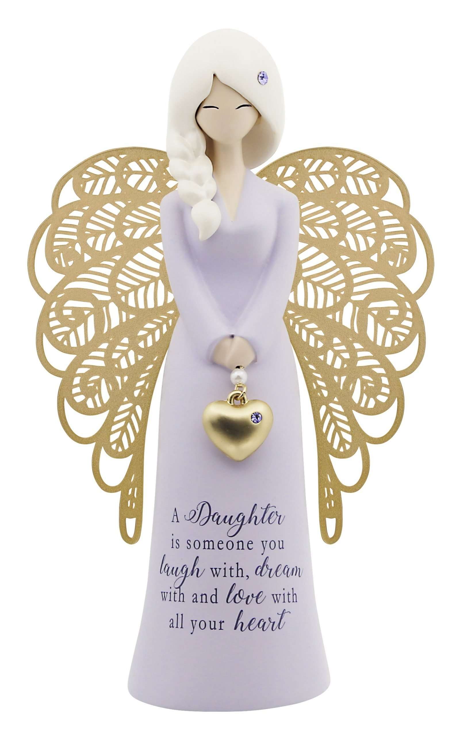 Moulded polyresin with metal wings, heart- shaped metal charm with debossed sentiment and jewel embellishments. Charm/wing colours are silver, matt gold or matt rose gold. Wings are laser cut.