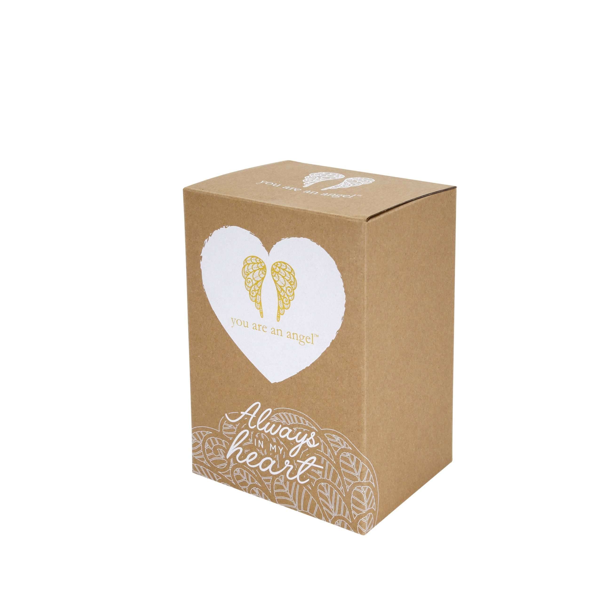 Moulded polyresin with metal wings, heart- shaped metal charm with debossed sentiment and jewel embellishments. Charm/wing colours are silver, matt gold or matt rose gold. Wings are laser cut.