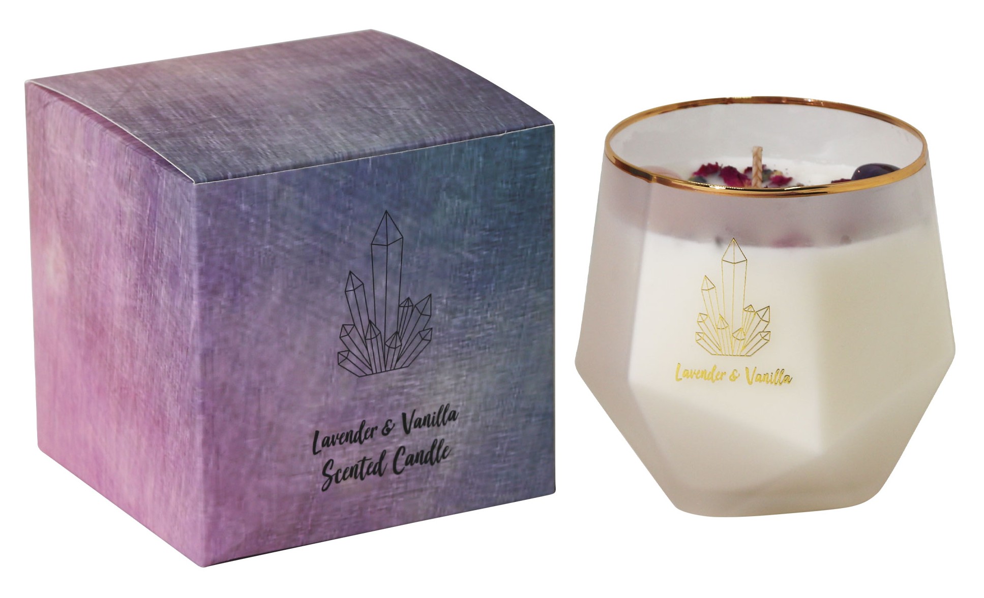 Pure Soy wax in a premium diamond-shaped jar with gold-plated rim. Jar size 10x10cm. 77hr Burn Time. With Real Rose Petals & Lavender Seeds