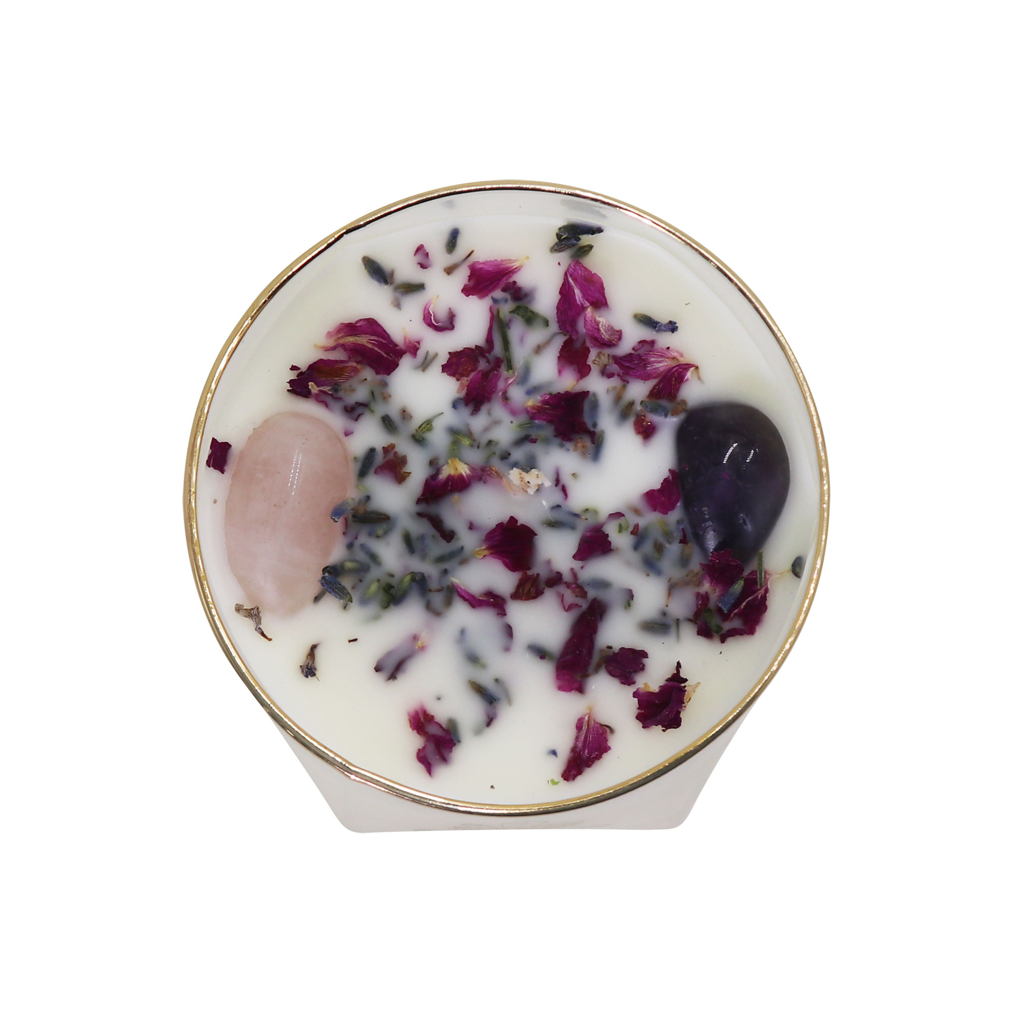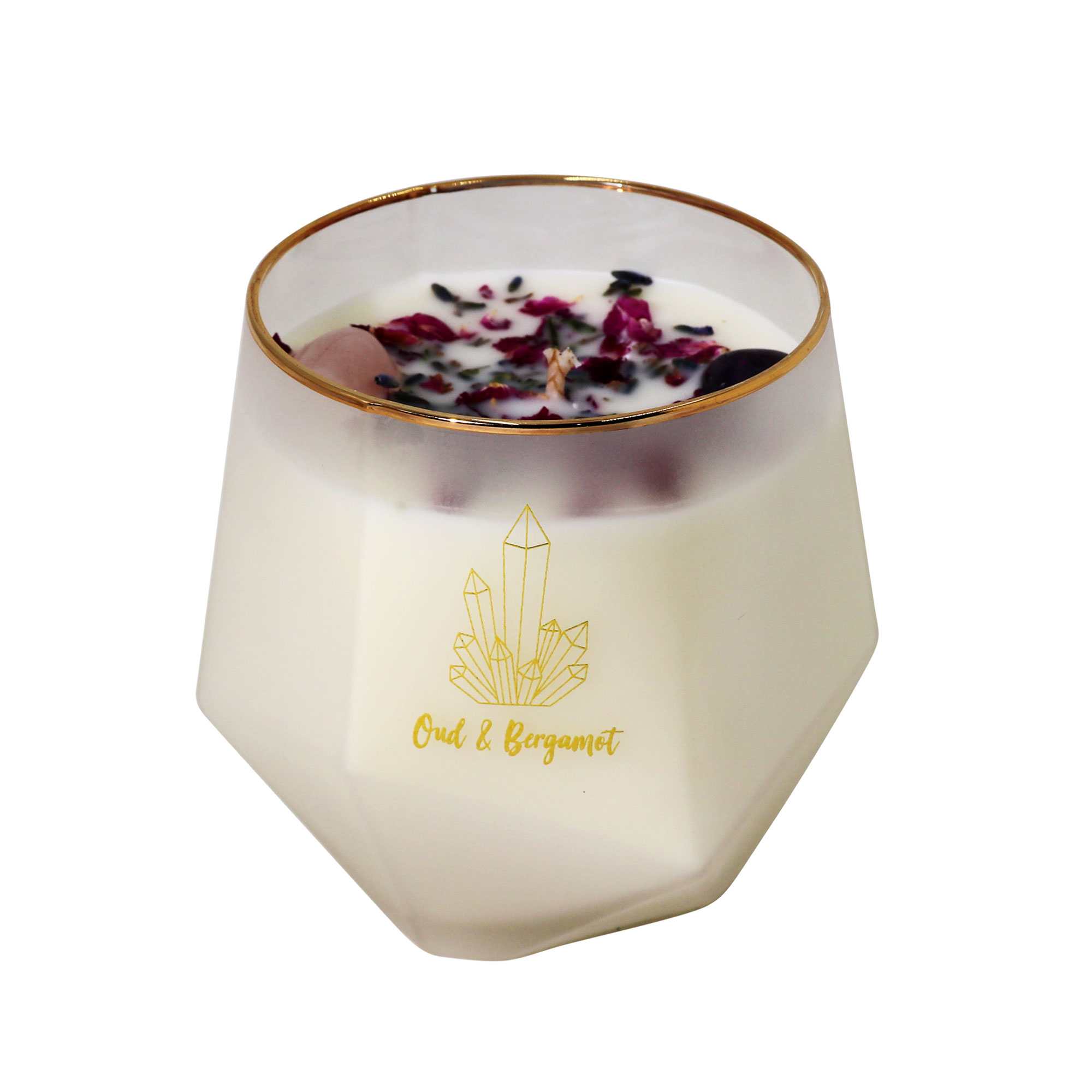 Pure Soy wax in a premium diamond-shaped jar with gold-plated rim. Jar size 10x10cm. 77hr Burn Time. With Real Rose Petals & Lavender Seeds