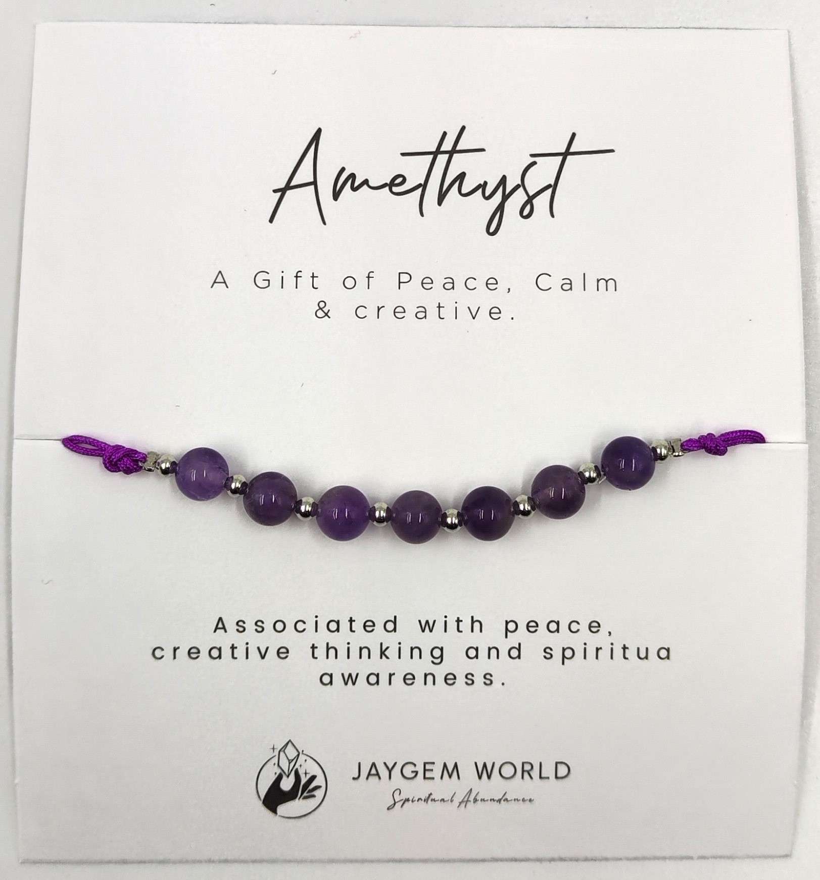These bracelets come in Amethyst, Rose Quartz, Clear Quartz, Tiger Eye, Fluorite, Carnelian.