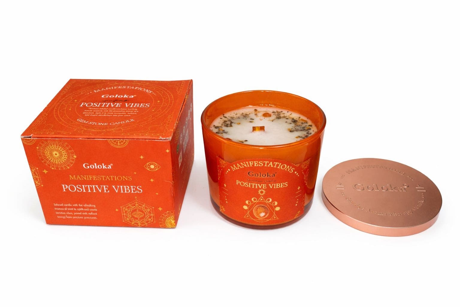 Goloka Manifestations Positive Vibes 9oz Gemstone Infused Candle Sunstone