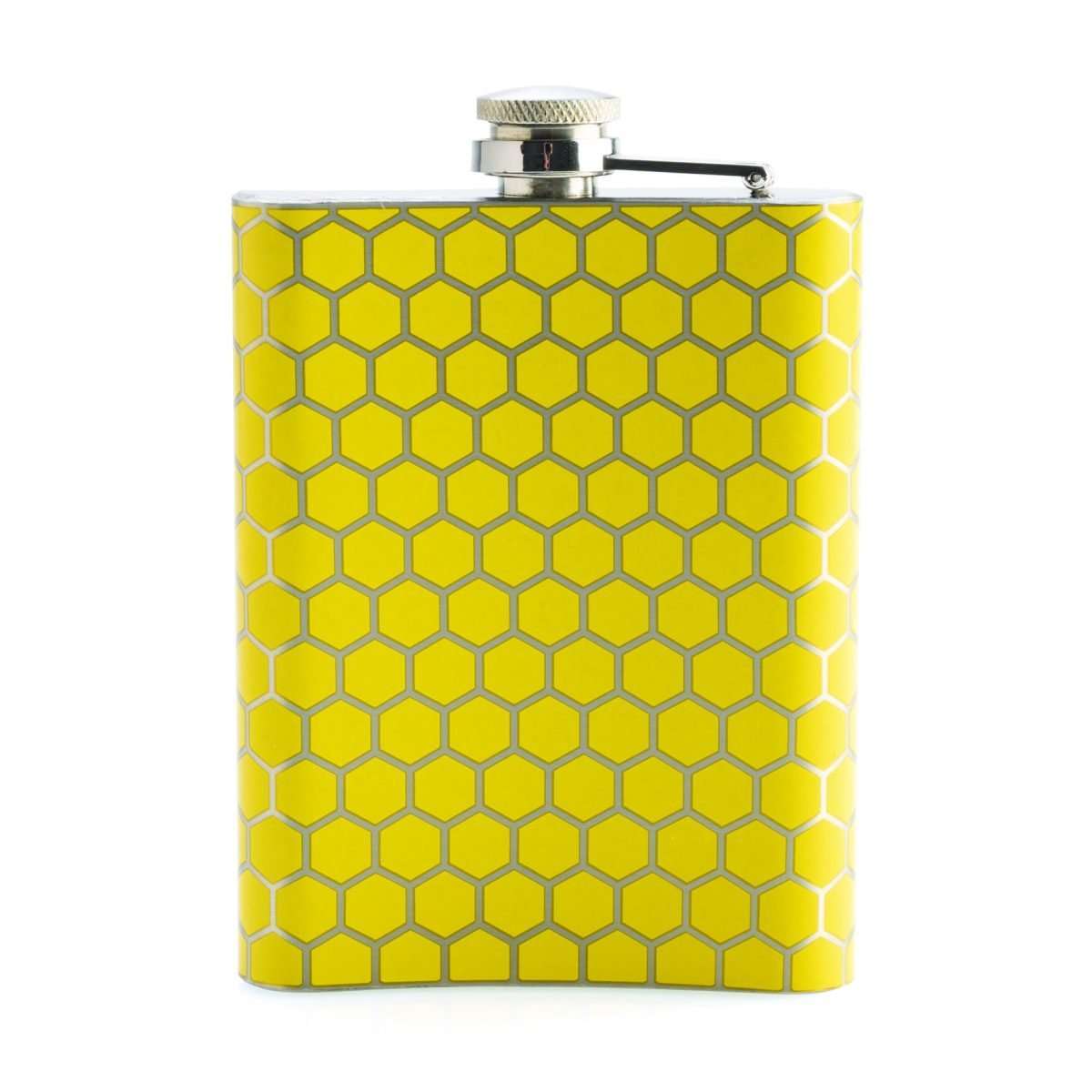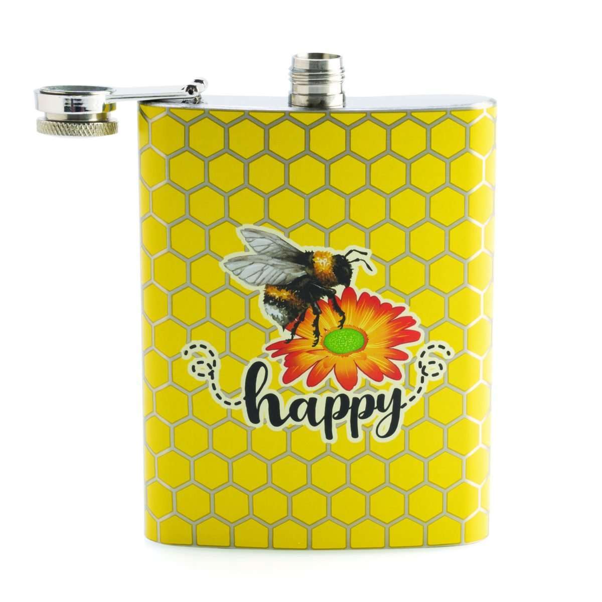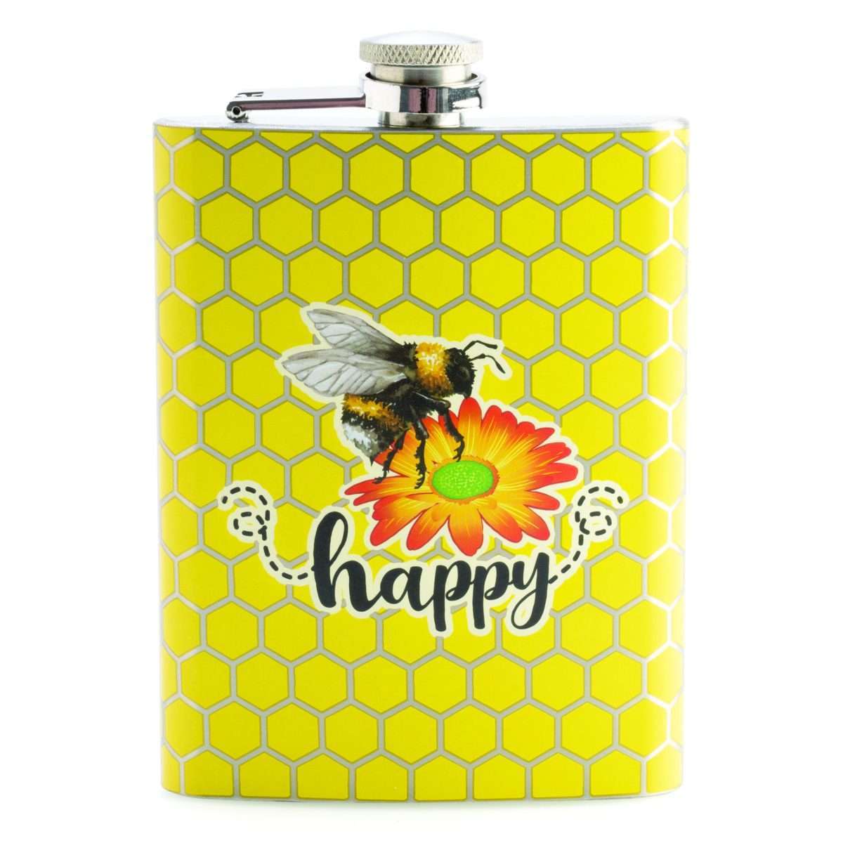 • Spring themed flask with a bee happy message over a bright yellow honeycomb pattern