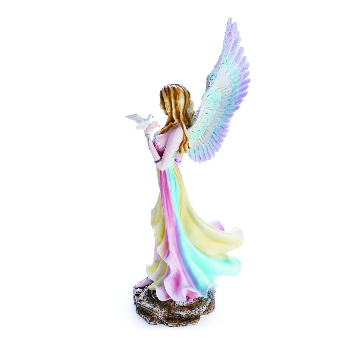 This stunning angel figurine wears a flowing rainbow gown, draping elegantly around her body. A small white dove with outstretched wings is perched on her hand. The gown is cinched below her feathered bodice with a pale sash, her dark blonde hair worn loose and her large feathered wings extended behind her. This angel home accent makes a lovely gift for any fan of angels and fantasy art.