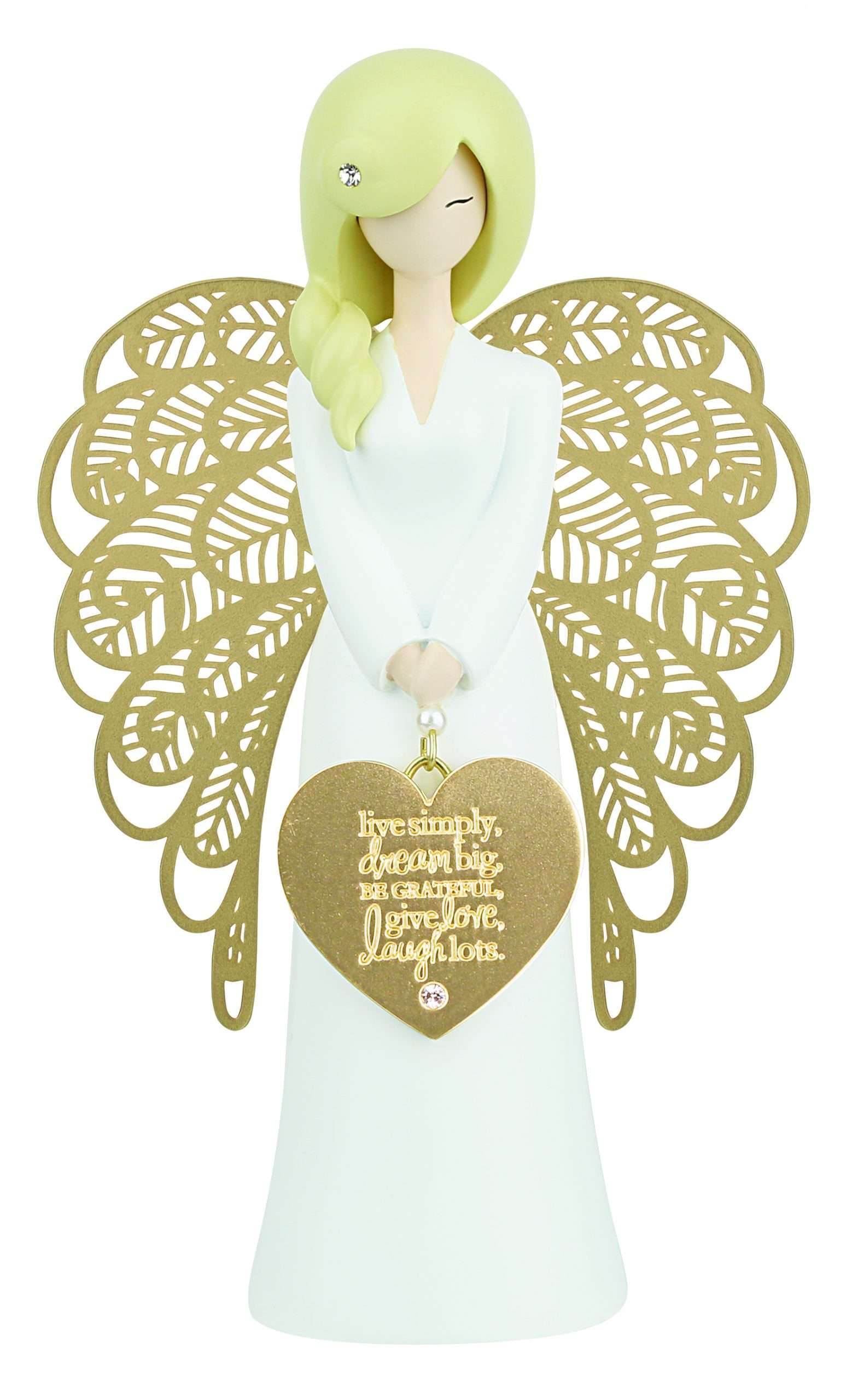 Moulded polyresin with metal wings, heart- shaped metal charm with debossed sentiment and jewel embellishments. Charm/wing colours are silver, matt gold or matt rose gold. Wings are laser cut.