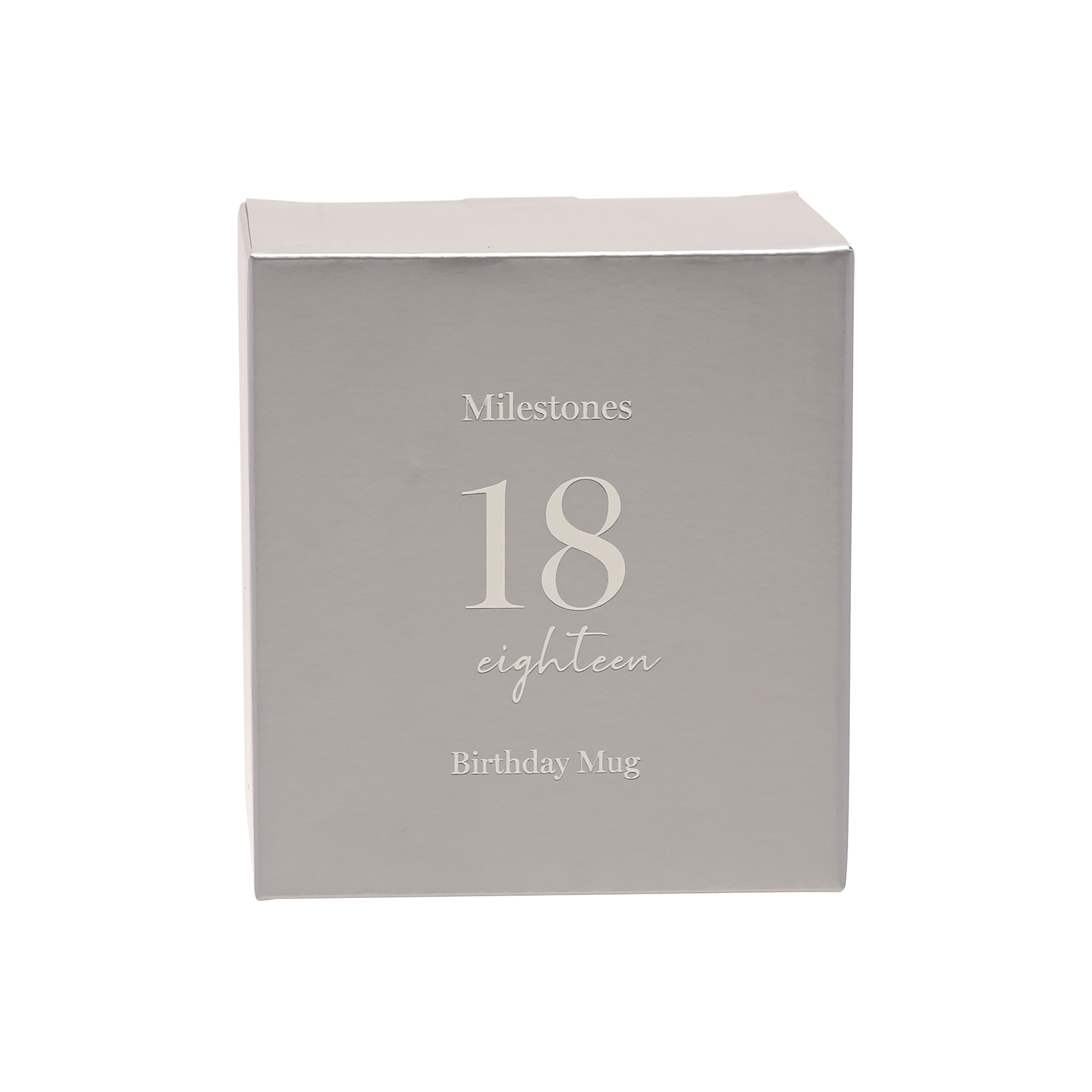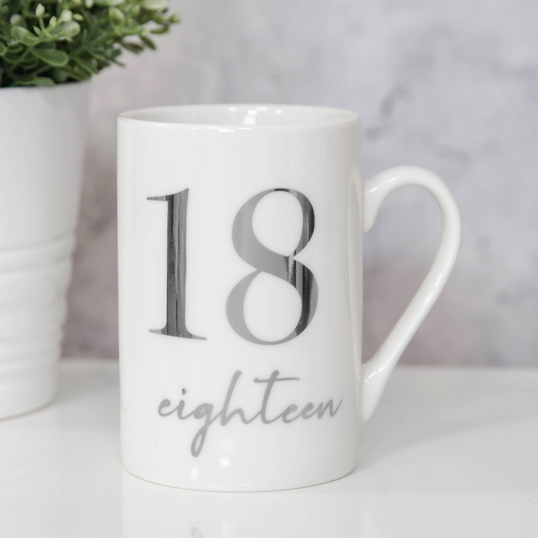 Help someone special toast 18 years in style with this crisp white porcelain mug with silver foil decal. Details: – Crisp white porcelain mug – 310ml volume – Silver foil 18 – EIGHTEEN decal – Window gift box – Not suitable for dishwasher or microwave