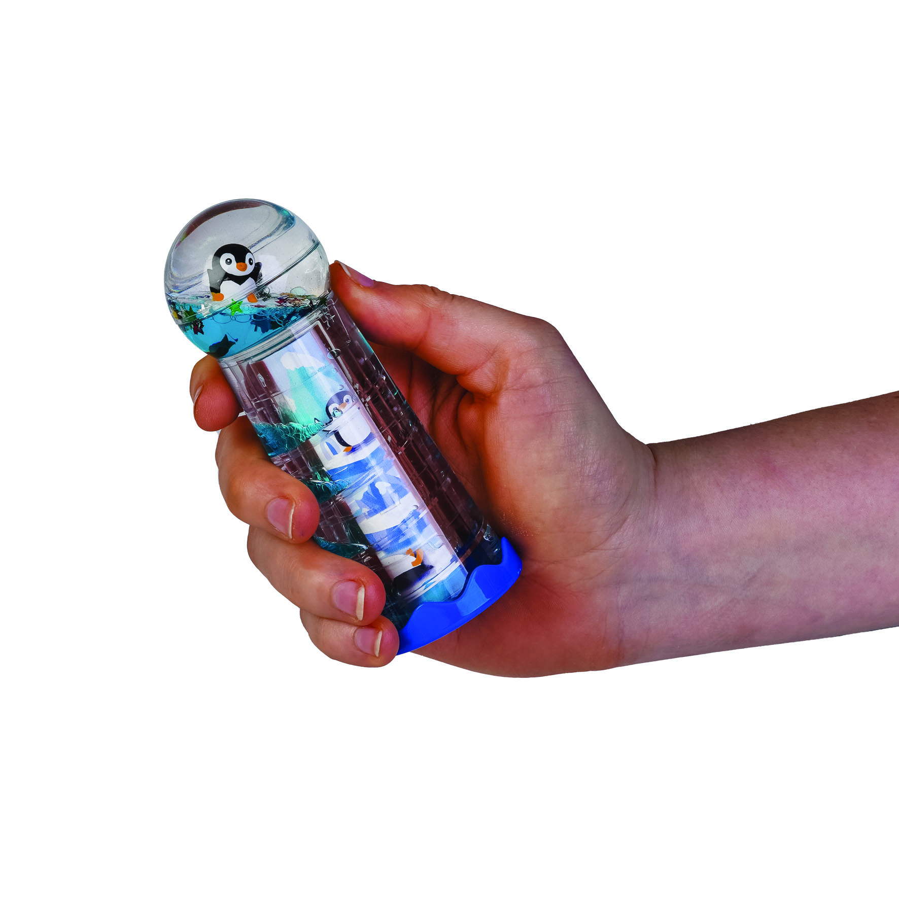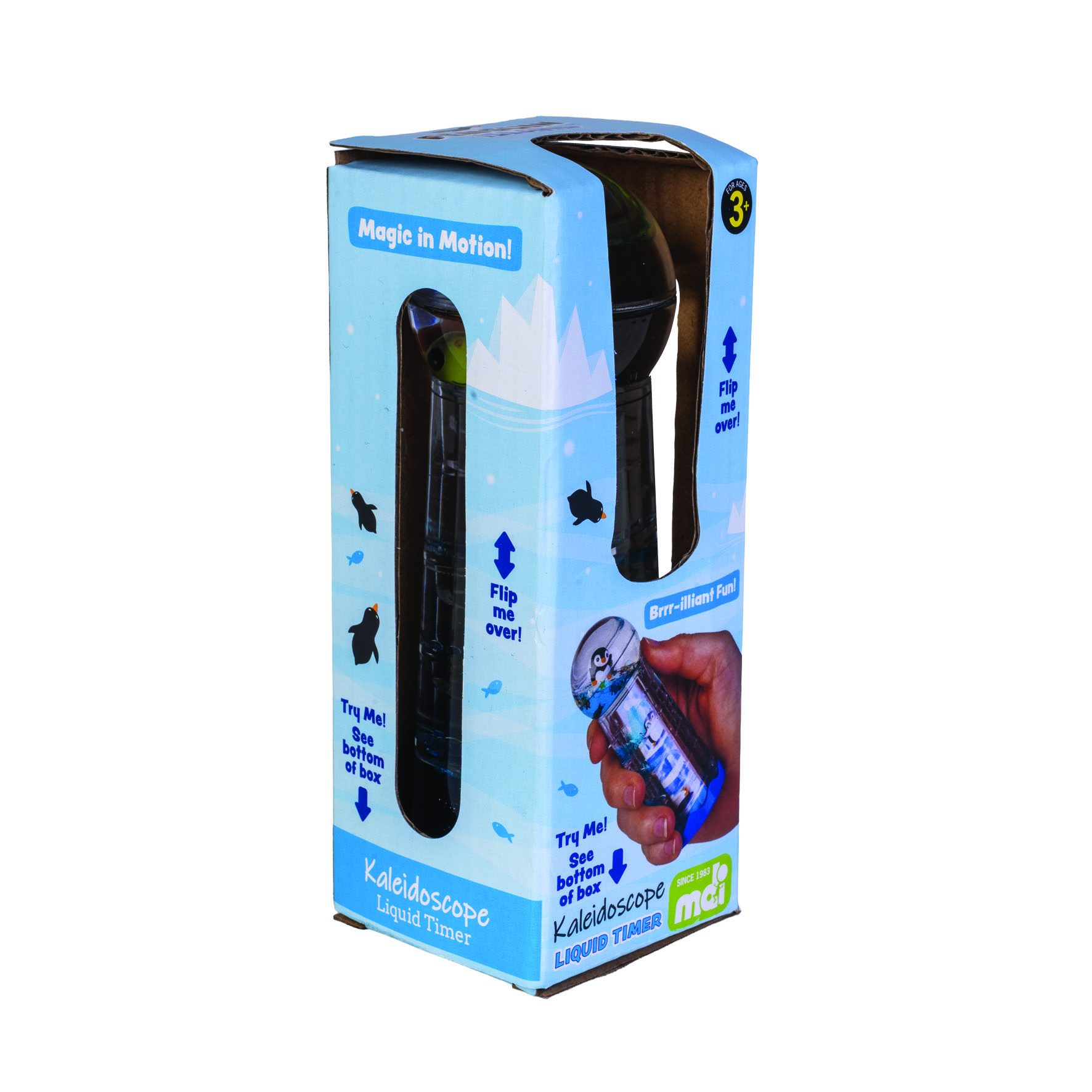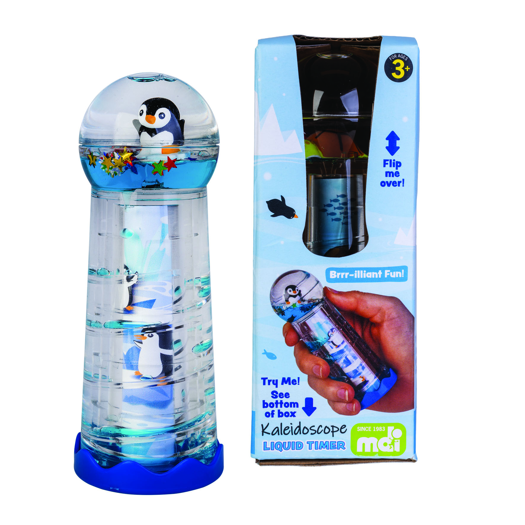 Penguin Island’s Liquid Timer Kaleidoscope offers endless play in colourful new ways! Floating inside the globe are glitter stars and a cool mini penguin. Watch as the blue droplets make their way down the spiral steps, then look through the base – it’s a kaleidoscope! Flip, shake, twist and turn for infinite fun!
