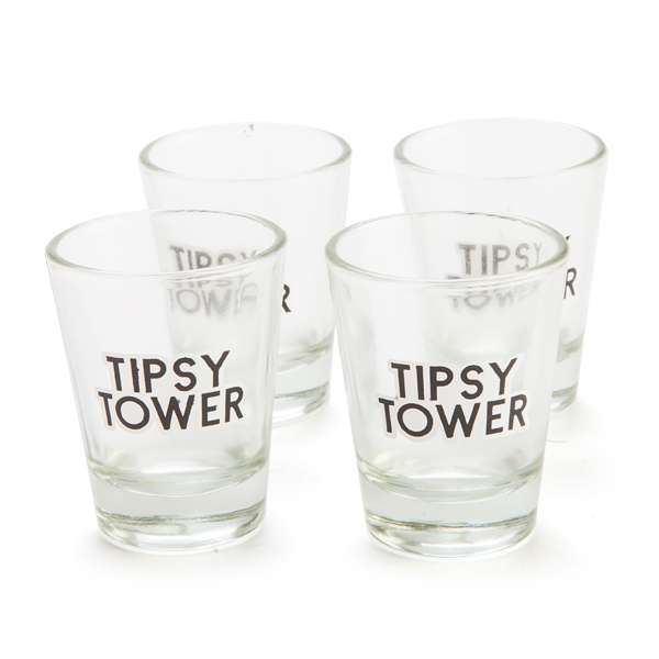 - Includes 4 shot glasses and a wooden block tower