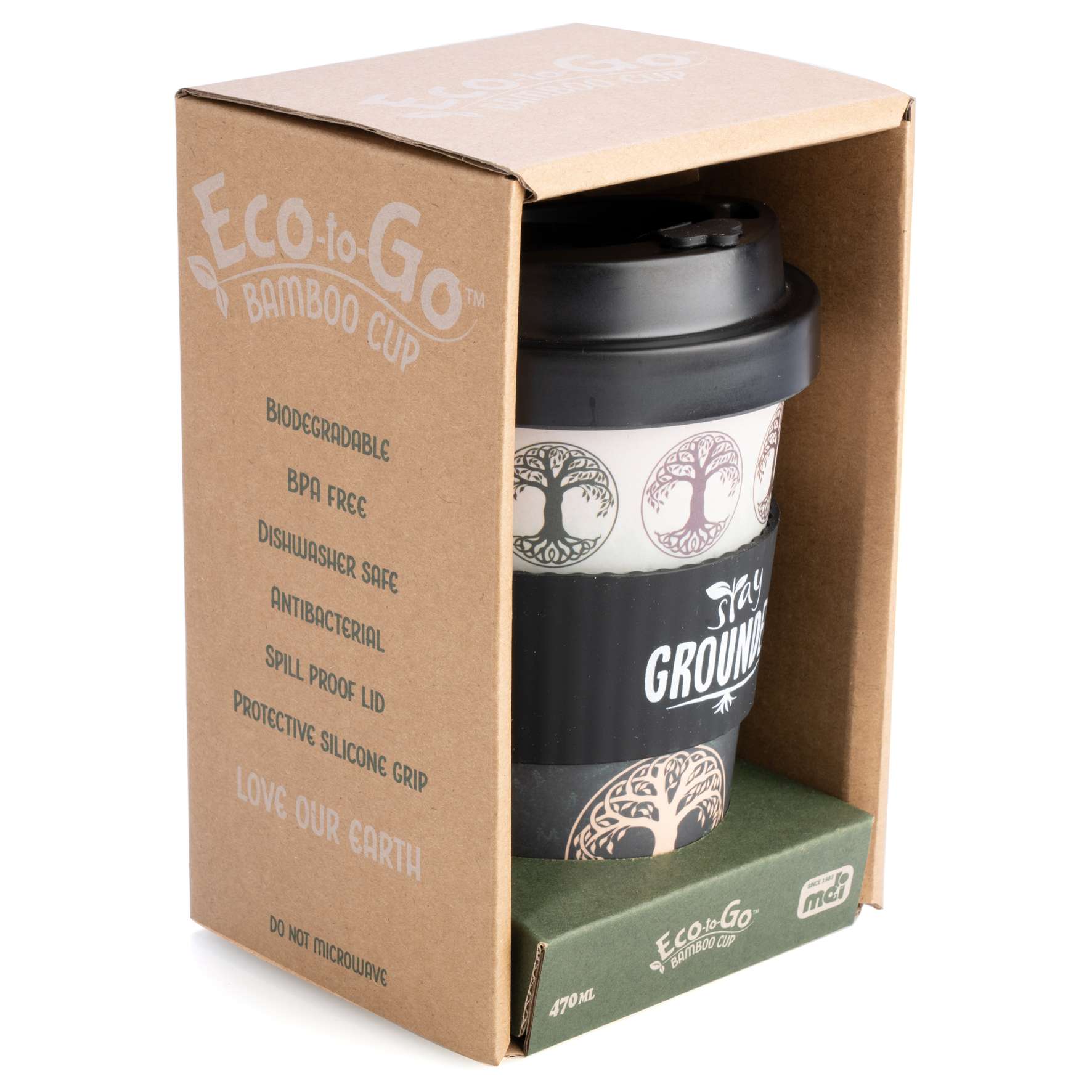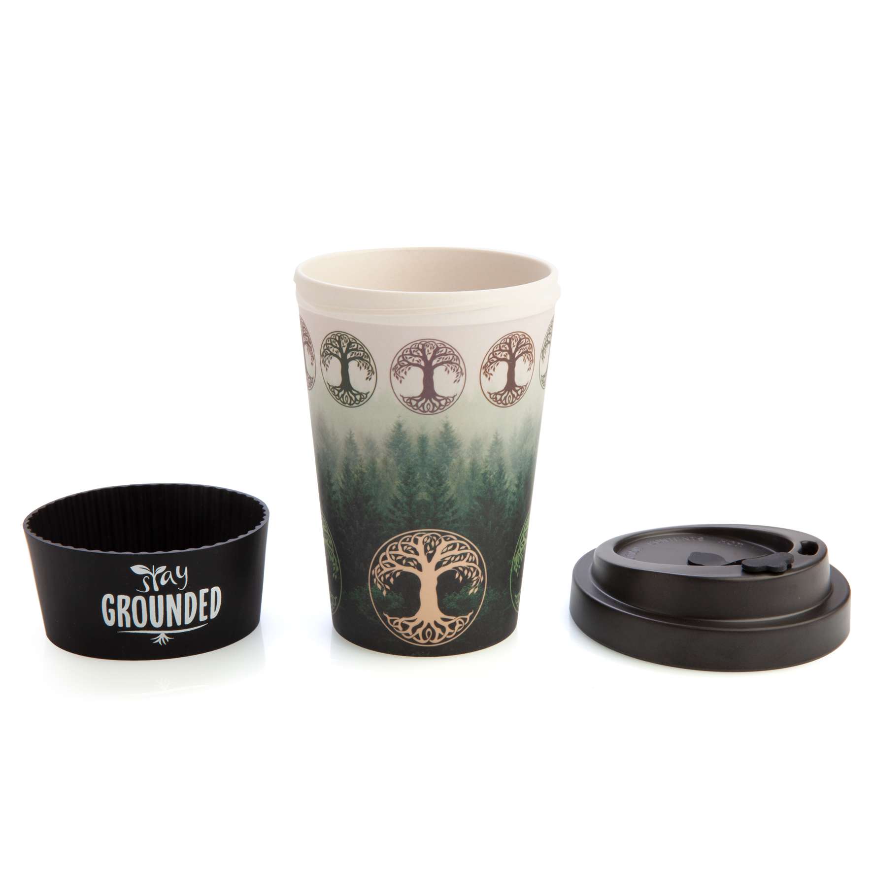 - Matching black anti-spill lid and protective silicone band with punny yet inspirational phrase ‘Stay Grounded’