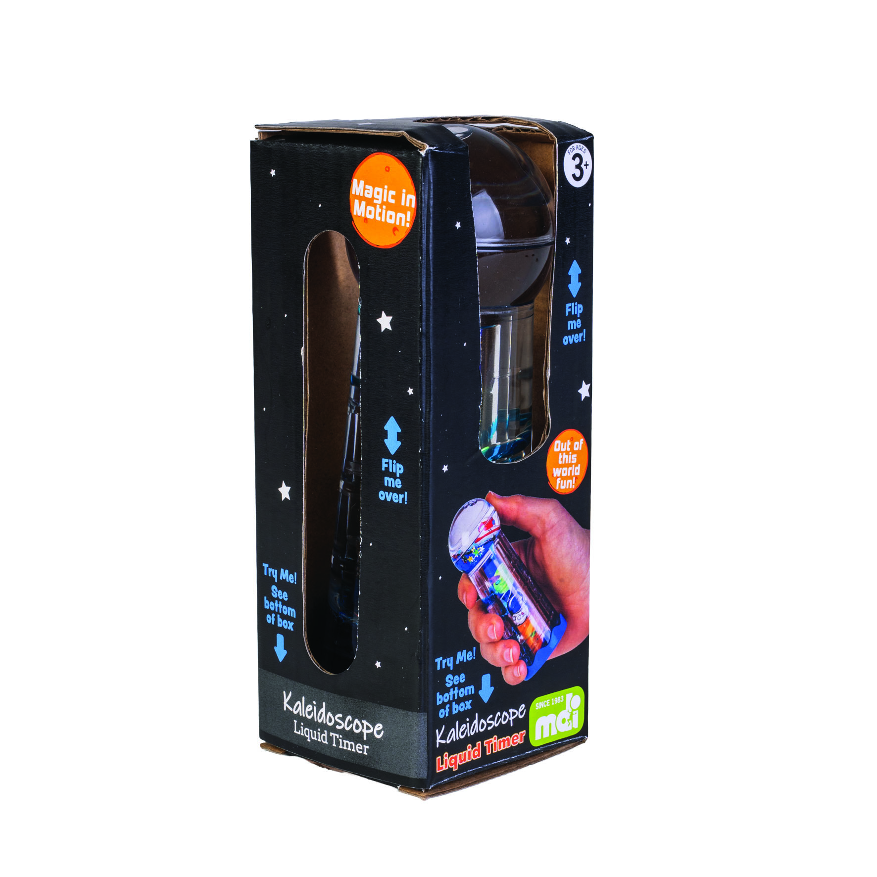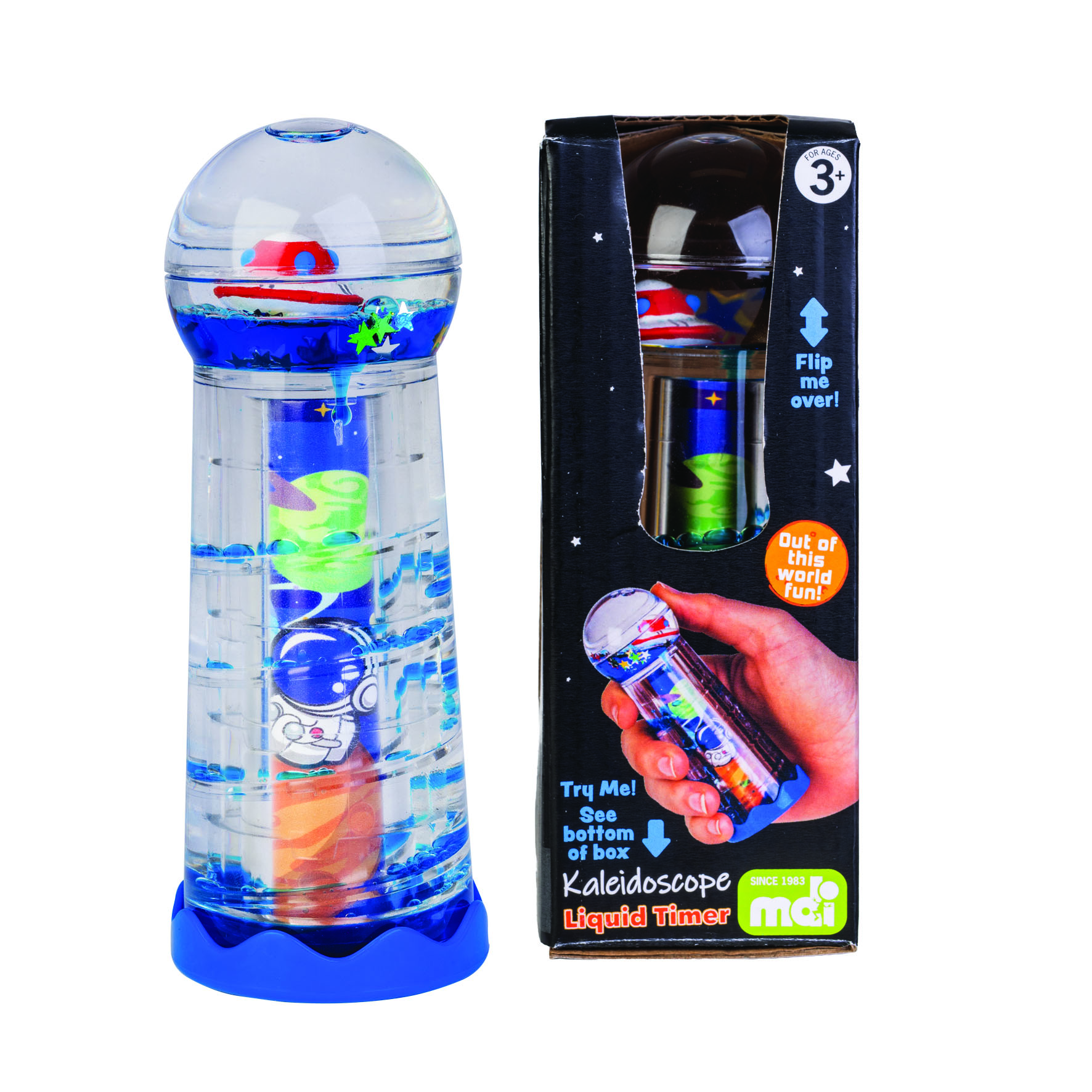 The UFO Liquid Timer Kaleidoscope offers endless play in colourful new ways! Floating inside the globe are glitter stars and a mini UFO. Watch as the blue droplets make their way down the spiral steps, then look through the base – it’s a kaleidoscope! Flip, shake, twist and turn for fun that’s out of this world!