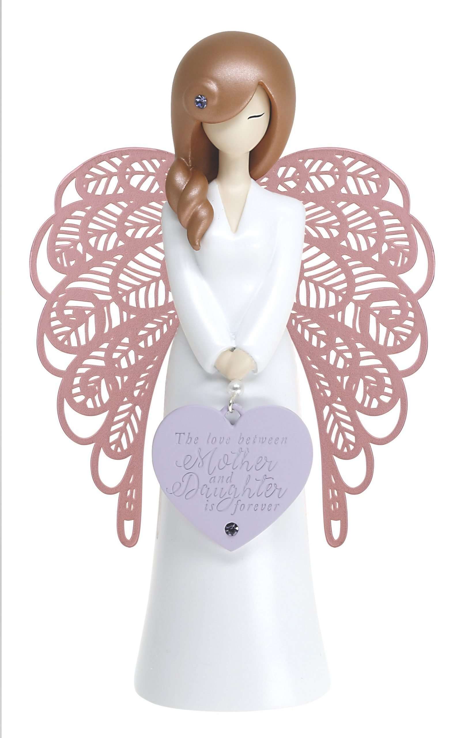 Moulded polyresin with metal wings, heart- shaped metal charm with debossed sentiment and jewel embellishments. Charm/wing colours are silver, matt gold or matt rose gold. Wings are laser cut.